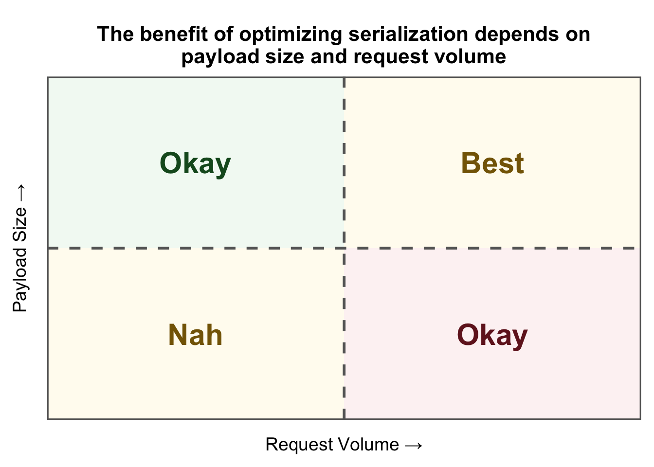 Object serialization usually won’t be your first priority when it comes to optimizing performance. When your API has minimal to moderate traffic and small response payloads, serialization won’t make much of a difference because Plumber’s built-in serializers are already sufficient for those scenarios. For example, suppose your API returns data that is queried by a data pipeline that runs hourly. If you tuned your API so that it can process the same sized dataset in 100 milliseconds instead of 10 seconds, the data pipeline won’t be any better for it because it still runs hourly. When traffic is high and payloads are large, however, the costs of serialization can add up quickly; in these scenarios, minimizing the serialization cost can be beneficial. The following table can help determine if focusing on serialization is right for you.